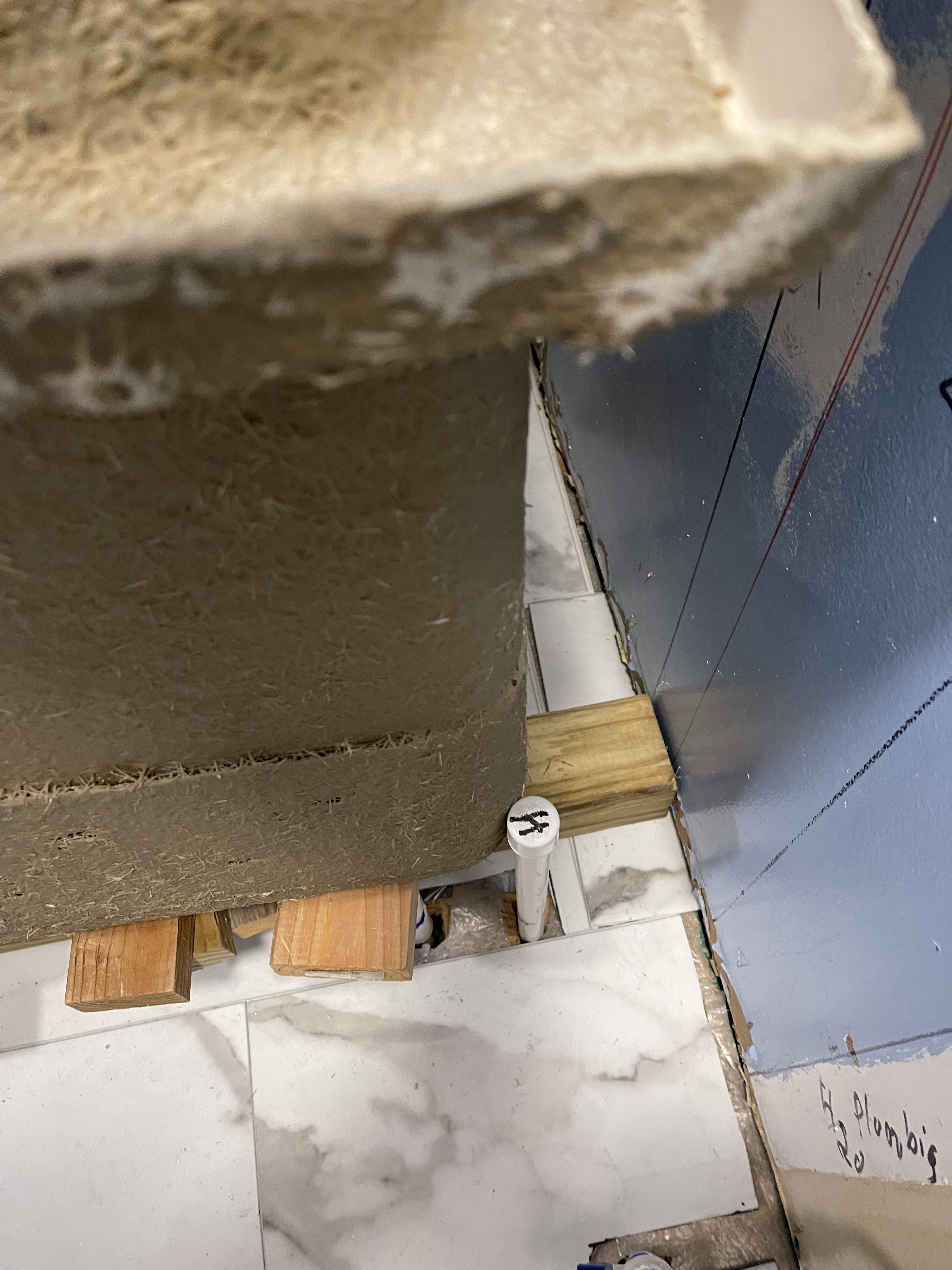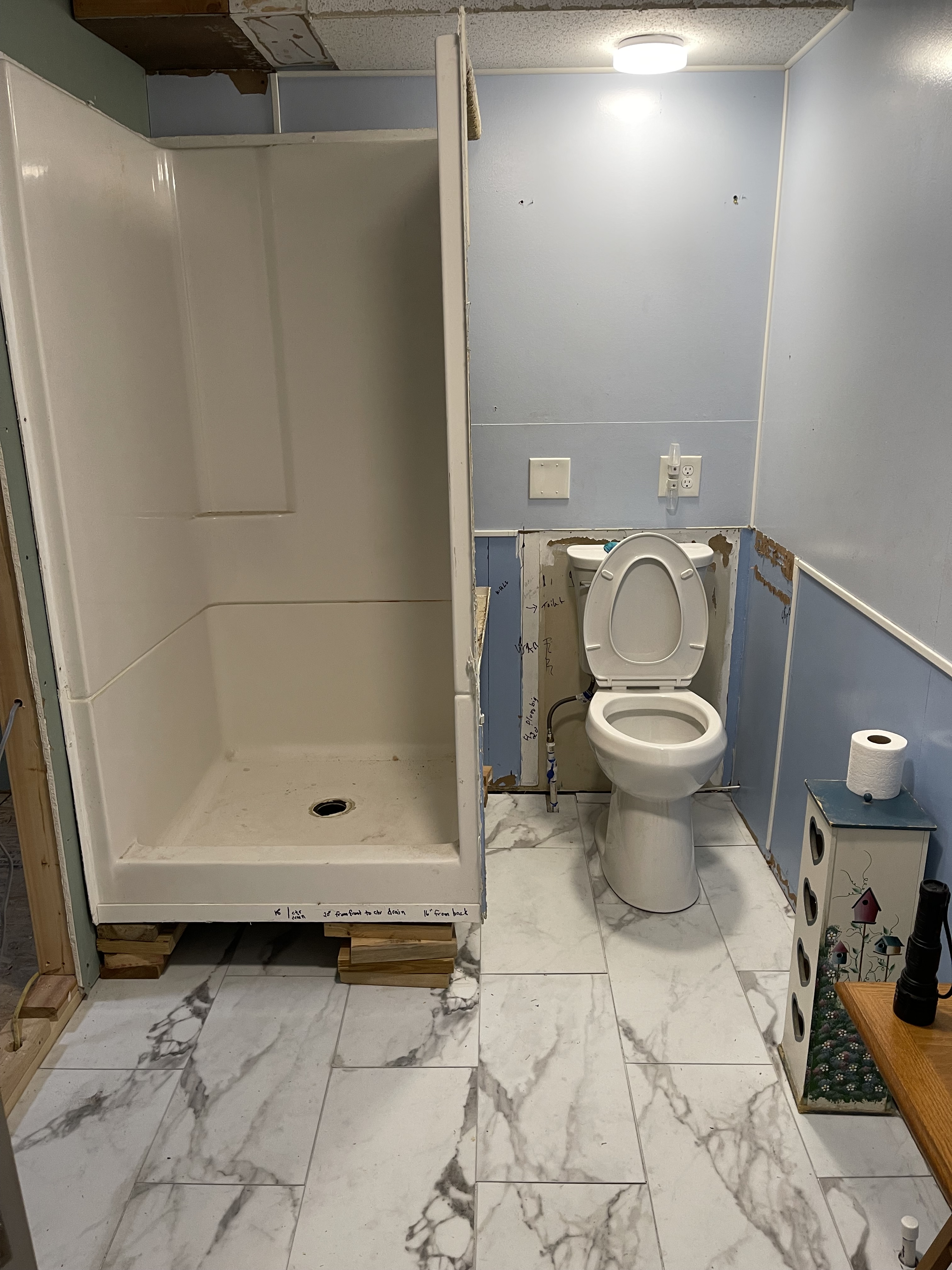 Then life got in the way of it being easy. This morning we moved the shower in front of where it was to go. Ron had for some reason made the drain pipe far too high from the floor decided to block the shower up so we could slide it back in place and lower it down over the pipe. We got it blocked up and several times the blocks fell sideways so we scrambled to keep the shower from doing any damage like braking a water pipe. Then as he got it back nearly to the wall reality made itself clear.