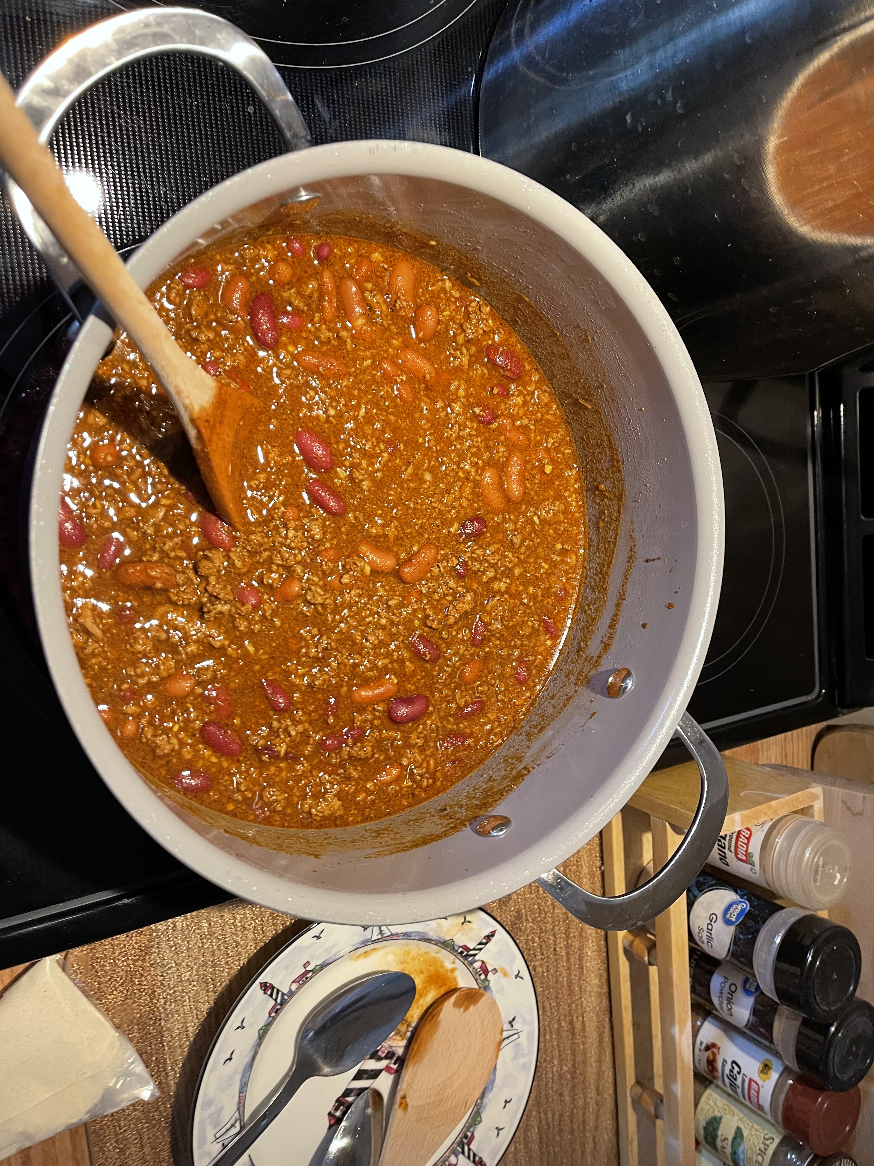 Then I got it to where I had only one thing left to decide, the masa. I had never added it before but I felt I should. What I was hoping was a rich brown smooth creamy sauce that the restaurant chili has and even the canned Wolf chili we get has. Mine did not come out like that. It was good but sadly not creamy reach like the store bought ones or the restaurant kinds. Ron added sour cream to his and said it made a big difference. The chili is not bad, it is very tasty and favorable. It just is more gritty and strong than it is smooth and flowing. Hugs and loves. If you have an idea what to do to make it seem more creamy and flowing brown, then please let me know. Best wishes for all and hugs for those that want them. Scottie