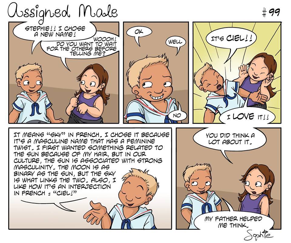 I love who Scottie is and think he is done very well with the life hand he was dealt. But all this is to explain why the series of cartoons by Sophie Labelle are so important to me. So here is the one by her that jogged me to make this post. I had tried to restrict posts about my abuse. But this was so on point I knew I had to do so. Sadly I had no father or other to help me find it, they hated that I demanded they call me by it. It caused me to hang up on them repeatedly when they would call me by my abused name. They finally did adjust when in their old age they needed me to help them. Hugs