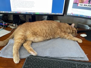 Something happened to Odie just before the hurricane, he started to have a lot of trouble with one of his back legs. We assumed he he caught it jumping down the steps we made for him to get off my desk. But after the hurricane it showed us that what ever is causing it got much worse. When we first got home he couldn’t hardly walk. He would walk a few steps with two or three of his legs out of his control, like he was very drunk. Then for a while he walked like his back feet were controlled by someone else. He thump walked. His rear legs went out from under him. And he thumped as he tried to walk. We would have tried to take him to his vet but their office has not been open yet as of last weekend. So now he is walking better. Very slow but all his limbs seem under his control. We really have no clue what the issue is, but one thing we do and don’t is let him jump down from any height as it will hurt him again. Which means we pick him up to anything he needs that is any height. When he is on my desk I or someone else must watch him so if he starts to want to get down we can pick him up and set him on the ground. He has learned the system, now he get food or treaties and comes to my desk and sits there looking at me or meowing. That means pick me up and let me take over your desk please. And you maybe shocked to know I do that. We do put him in his personal chair next to the window because it is much lower than the desk and if we don’t put him in that chair he will struggle to get into it himself. We do notice that instead of jumping out he slides out on his stomach. This is just one more in a long list of issues we are dealing with after the hurricane.