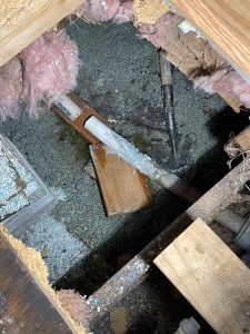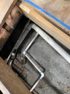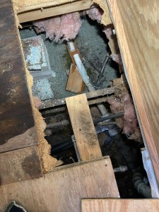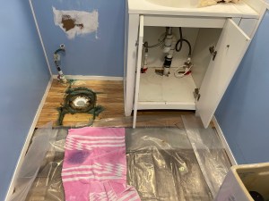 He carved a large portion of our own bedroom master bathroom we had planned to use for a large shower to put a shower in the hallway bathroom. He then built our own much smaller bathroom shower in the space left. Now that James has been gone for years Ron simply has been too tired to deal with changing anything. The leak of the sink gave me the opportunity.