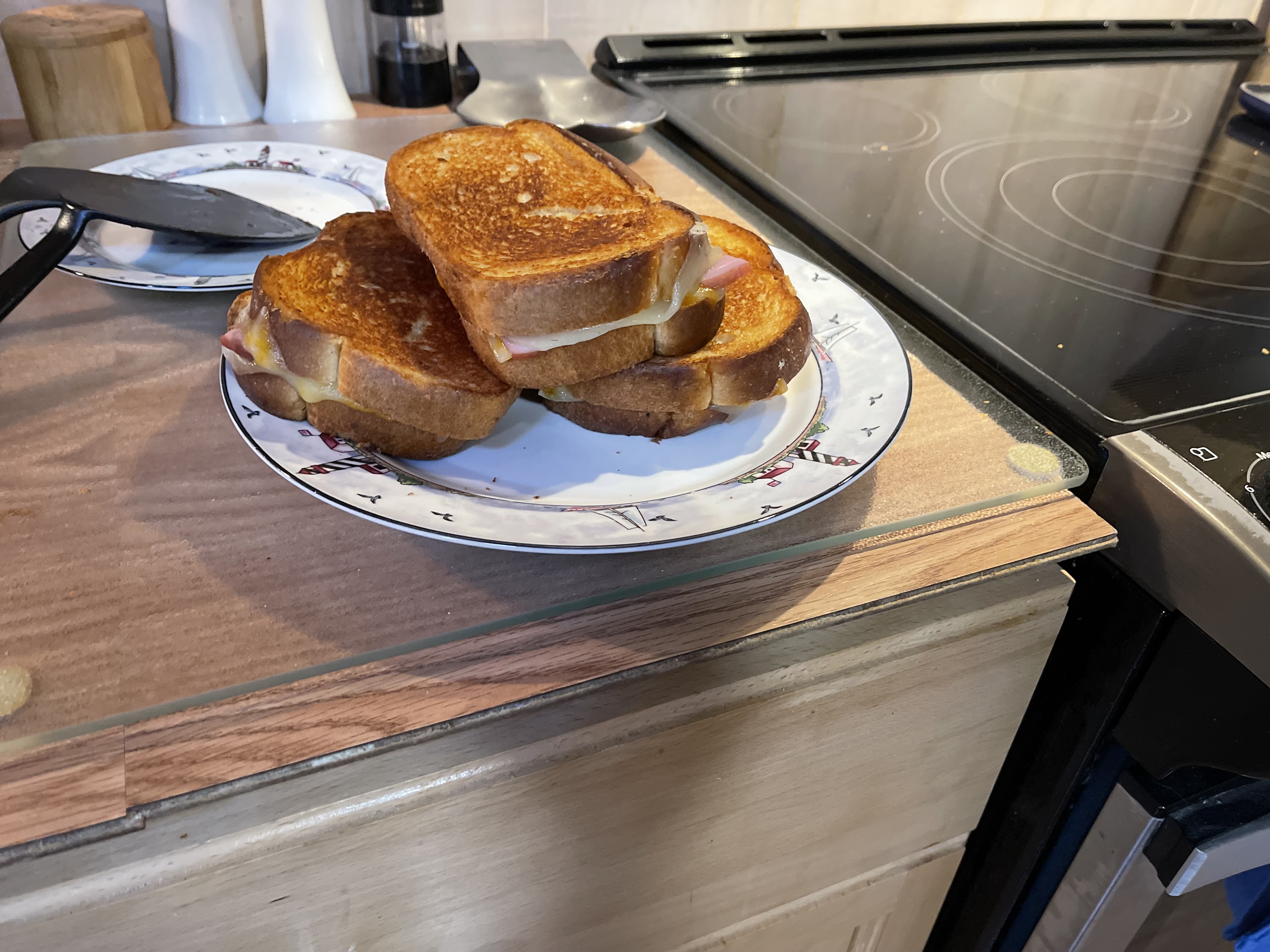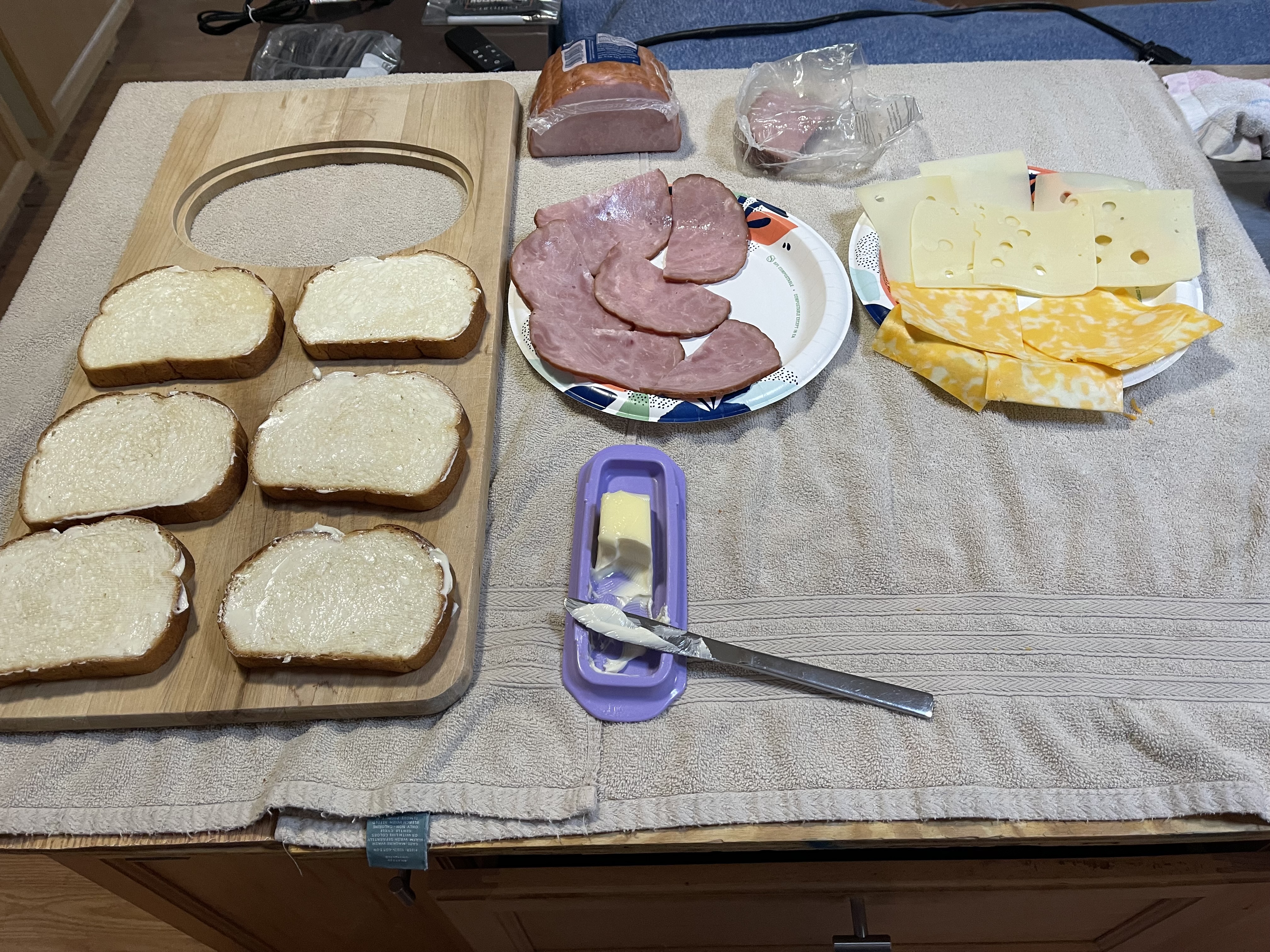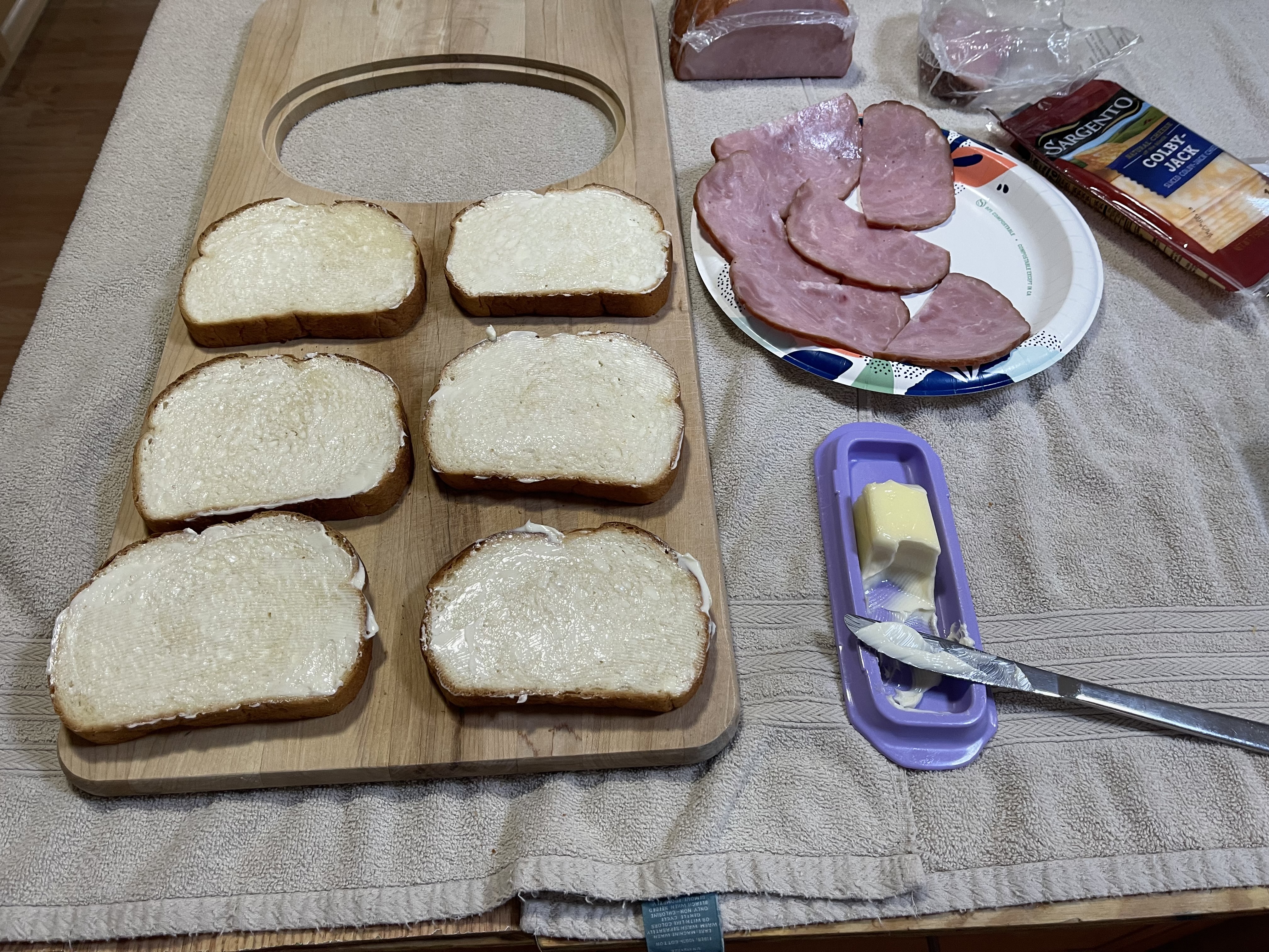 If you notice I have already buttered the bread. I is important to use real butter and not a substitute as the substitutes burn before the bread is toasted, the cheese melted, and the ham hot. Now to build the sandwiches.
