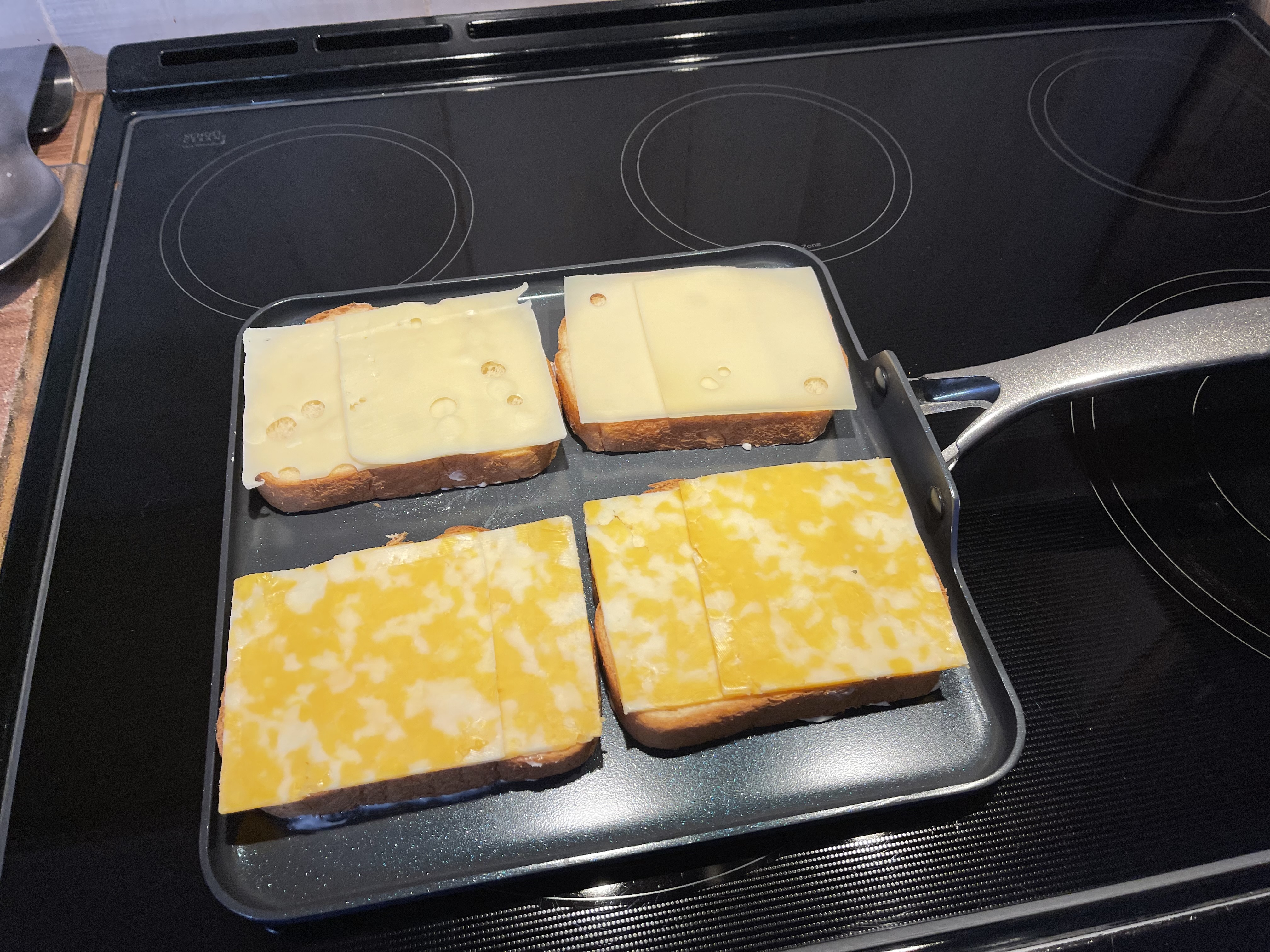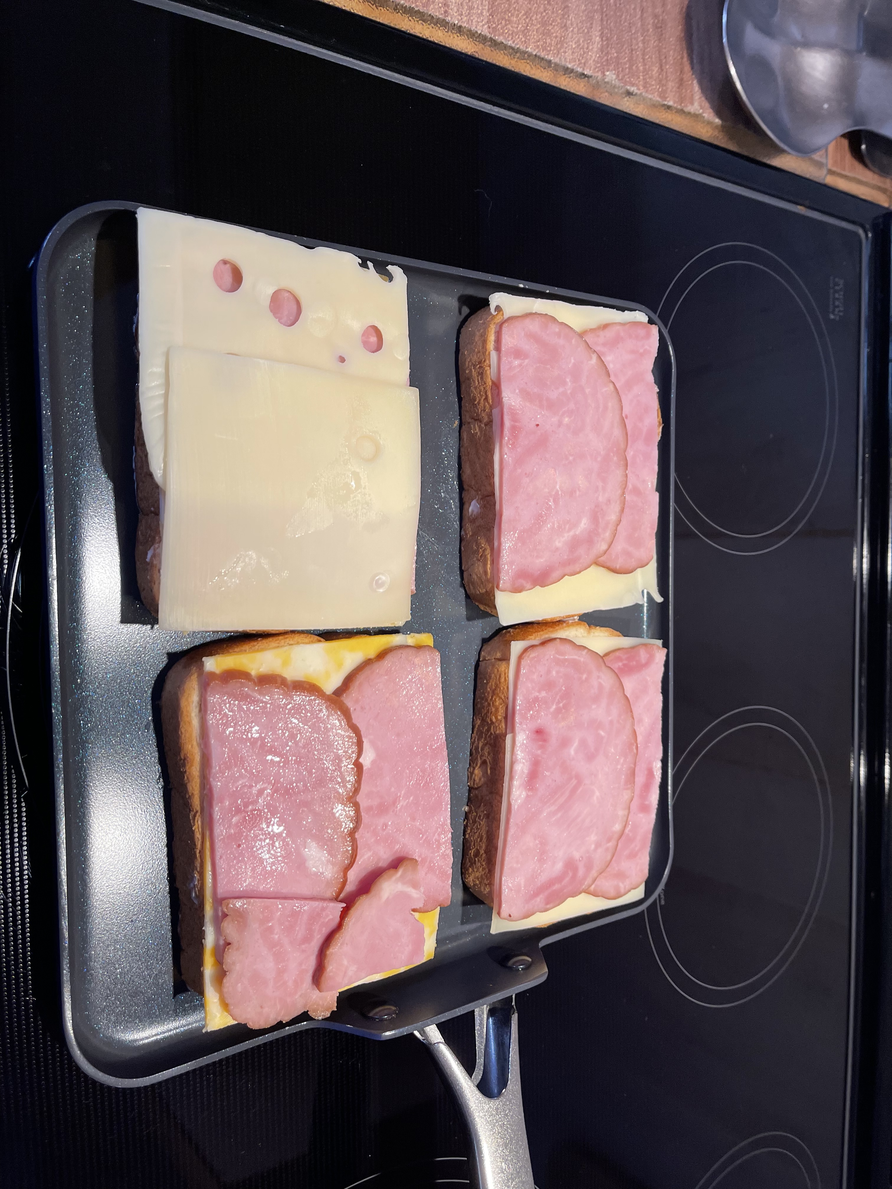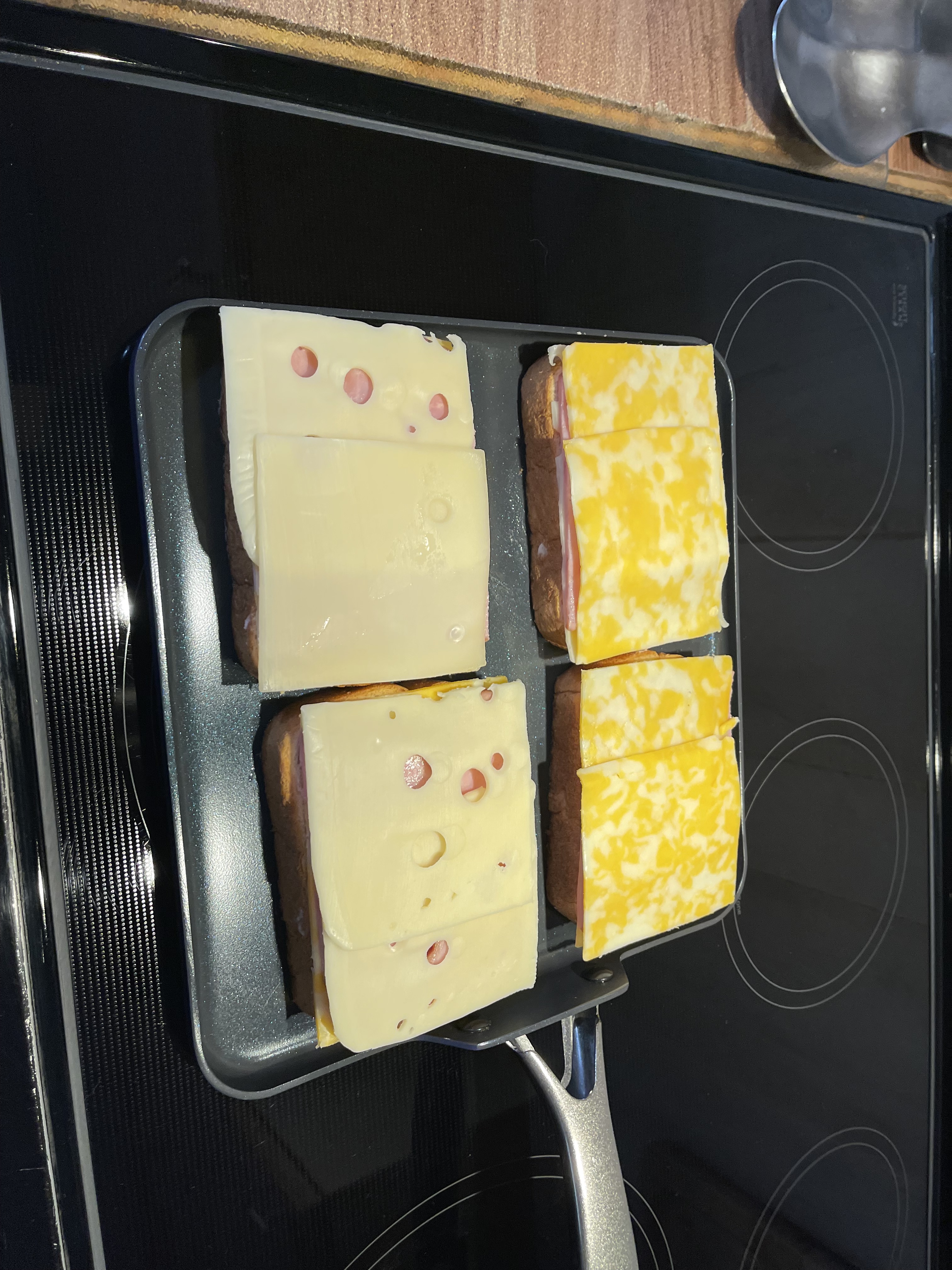 I used two different cheeses on on each side of the bread. Swiss and the other side colby Jack. Then two slices of ham.
