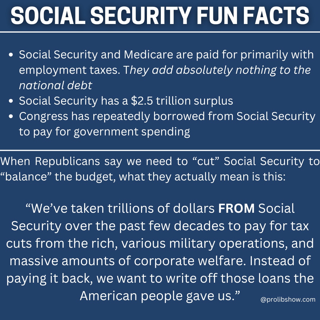 This is something that a lot of people get wrong because the US debt is never explained. The US debt is held in bonds which anyone can invest in. Yes, it’s technically borrowing, but it’s borrowing like one lends money when they invest in even a 401k or savings account. That money earns interest. And the money “borrowed” from social security is really that the social security fund is held in interest-bearing bonds. What republicans want to do is cut medicare and social security so they don’t have to make good on those bonds.