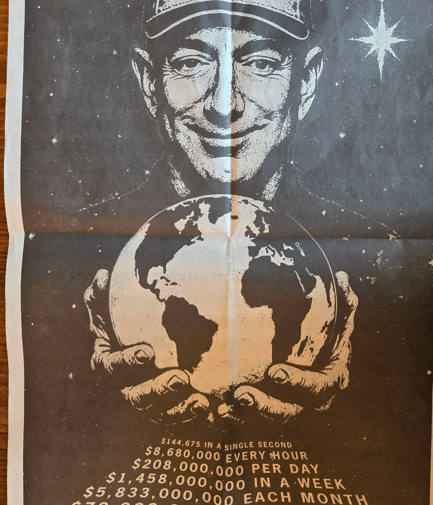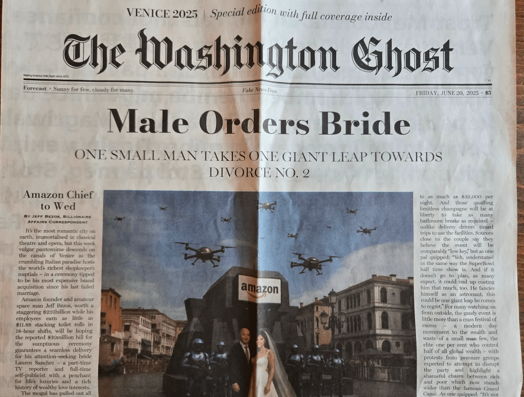 … is proud to re-publish, here, an unsigned parody newspaper that showed up on the streets around The Post building today, tucked under windshield wipers, etc. It’s four pages. That is the front page above, top and bottom, and the back page. It appears to be generated by Brits — they use the word “lorries” and “toilet rolls” — and is about Jeff Bezos’s revoltingly, ostentatiously tone-deafedly expensive upcoming marriage in Venice to the generously bodiced Lauren Sanchez at a time when his Post is drastically contracting its operation and jettisoning sections to save money, and when his overworked Amazon employees earn peanuts and have to pee in jars to meet their quotas.