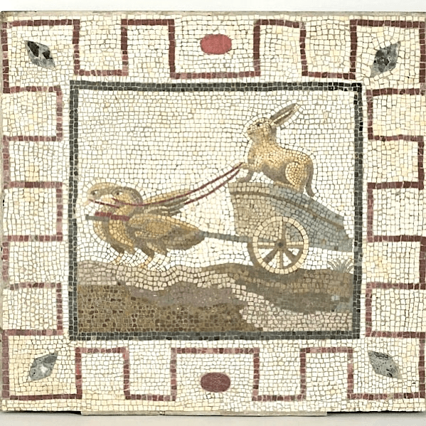 This particular mosaic is part of the Louvre’s extensive collection of Greek, Etruscan, and Roman Antiquities. It illustrates how Roman artists loved playful or satirical imagery alongside more serious mythological and realistic scenes. The rabbit, a symbol often associated with fertility and speed, paired with the absurdity of it driving a chariot of geese, reflects both Roman wit and their fondness for decorative exuberance.