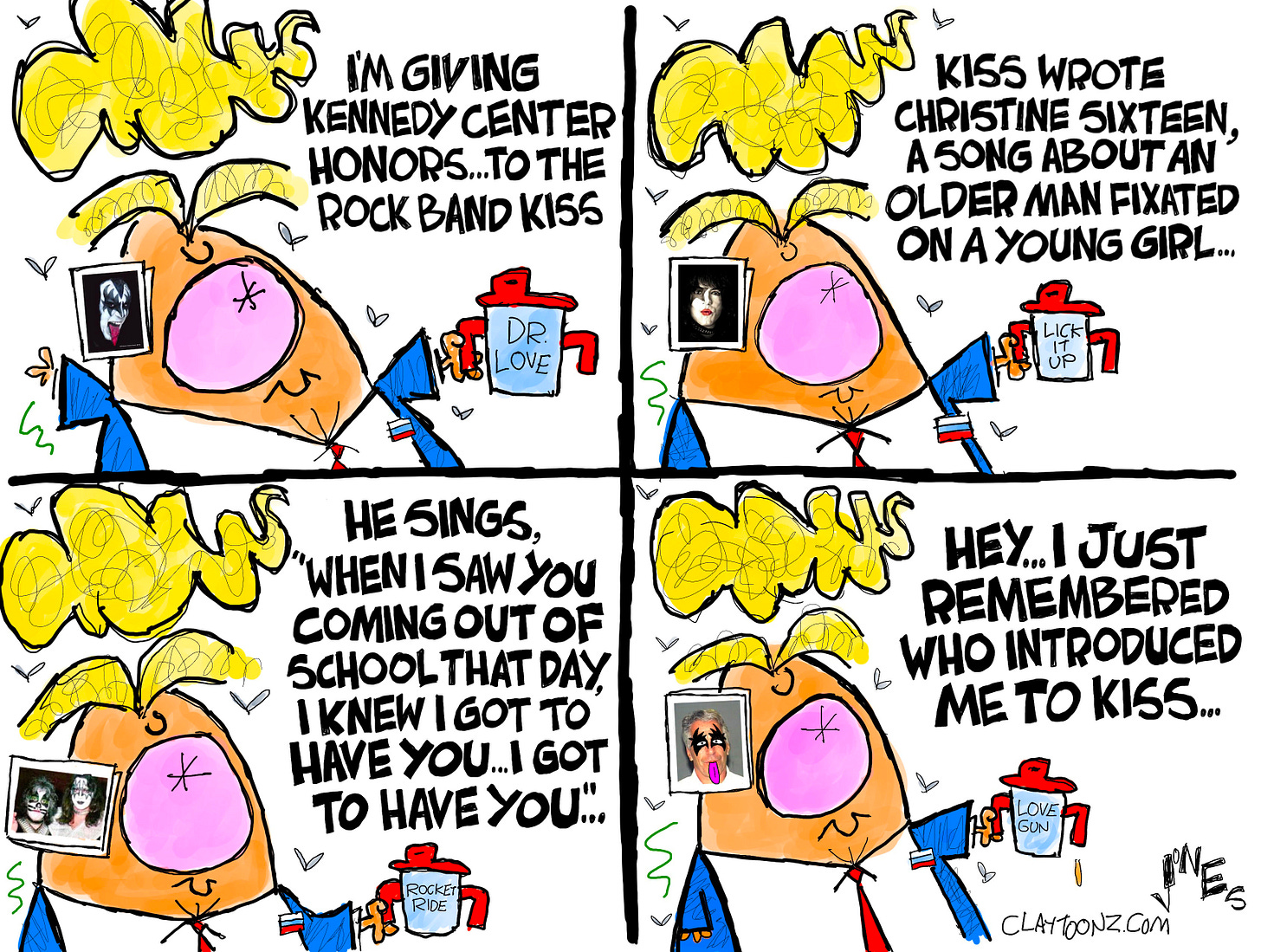 And, yes. KISS has a song glorifying pedophilia. Gene Simmons wrote it. I had to adjust the lyrics for space, but those cited in the cartoon say,